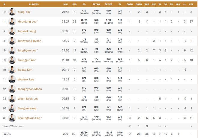 韩国队1号李贤重本场比赛三分球14投9中,拿到全场最高的33分,仅三分球就拿到32分。