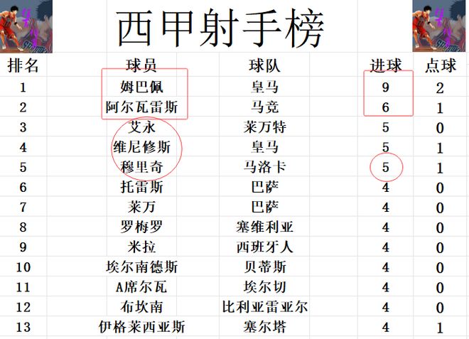 射手榜方面,姆巴佩9球稳居榜首,阿尔瓦雷斯6球位列第2。穆里奇今天打入一球,追上维尼修斯,艾永5球并列第3。莱万今天缺阵,和托雷斯,A席尔瓦,罗梅罗等人4球挤入前十。